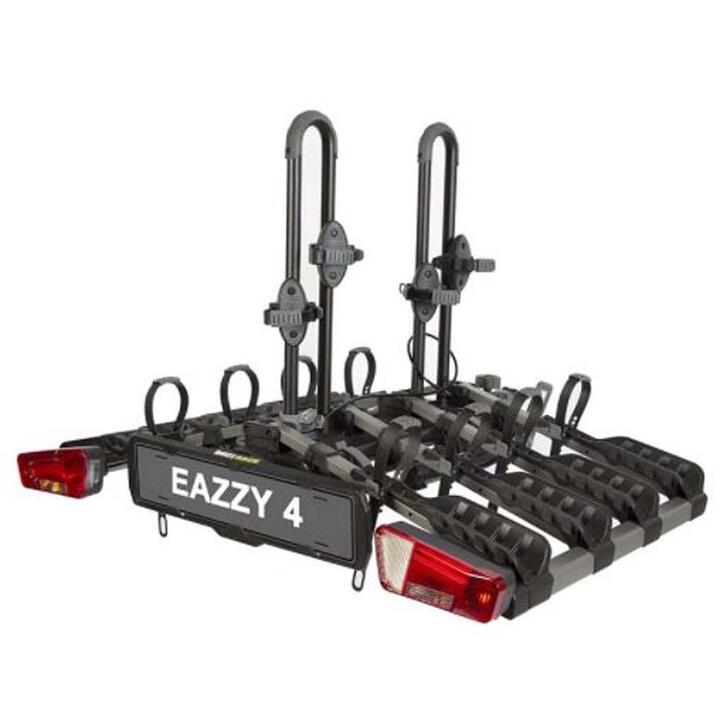 Fully foldable EAZZY series offer convenient mounting, user-friendly functions and compact storage. The ratchet cradle is the perfect solution to attach the bike frame. It is also a great solution for carbon frames as it does not apply pressure to the carbon tubes. The BUZZRACK Eazzy 4 is a really well designed, well engineered piece of kit; smart, sophisticated and very good value for money. Easy! The Eazzy 4 is very easy to fold which makes for easy lifting, easy carrying, easy fitting, easy storage in the car boot when you are out for a ride. Folds to store in the car: this is really useful, because damage to tow bar carriers in car parks from other vehicles can be an issue. A tow bar carrier will almost certainly make your car much too long for a standard car parking space. More detail about folding: because the support trays fold into the bike holder uprights (there are straps to hold them closed) the Eazzy 4 is easy to carry around, easy to fit and remove, and easy to store. The metal parts are steel, not aluminium, and it weighs almost 20kg, but because it’s a vertical 2-handed lift it feels much lighter than this, and there should be no strain on your back when moving it and fitting it. Most 4 bike wheel support racks are relatively very awkward and hard work to handle compared to the Eazzy 4.